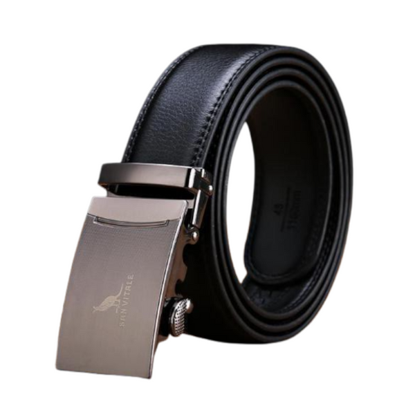 Black cowskin belt with automatic metal buckle. The belt is 3.5 cm wide, the rectangular buckle is 7.8 cm long and 4 cm wide. With an engraved logo in the middle of the buckle.