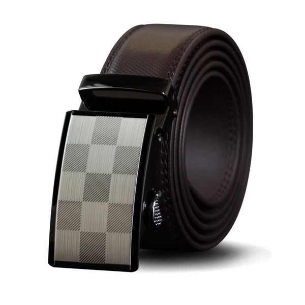 Genuine cowskin leather belt with automatic metal buckle. The belt is 3.5 cm / 1.4 Inch wide and can be modified to waist girth. The rectangular buckle is 8 cm / 3.1 Inch long and 5 cm / 2 Inch is decorated with checkered print.