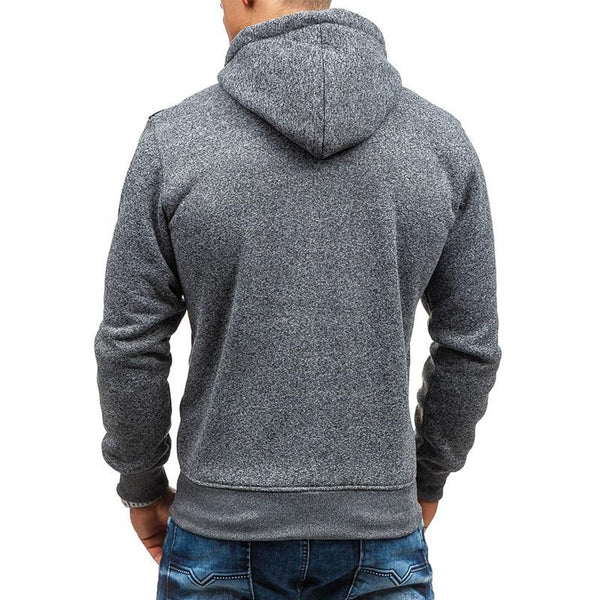 A stretch knit and slim fit hooded sweater with a full front zipper and drawstring hood. It features banded cuffs and trims, two open side pockets, diamond pattern chest panels, and contrast-colored strap and hood lining.