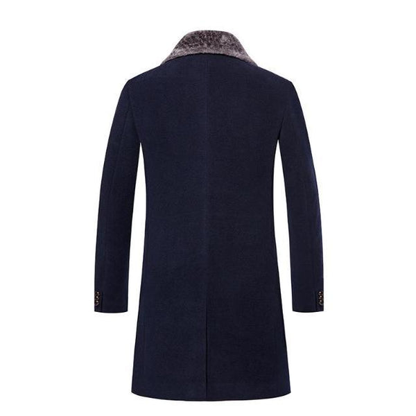 Long slim-fit woolen coat with lapel collar and single-breasted button-down closure. Has two oblique side pockets with no closure. Has slit back, cuffs are decorated with buttons. Plain-colored, collar and pocket hems are covered with faux fur. All buttons have polished, hemispheric wooden head.