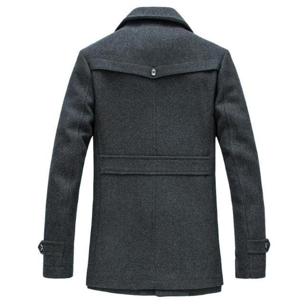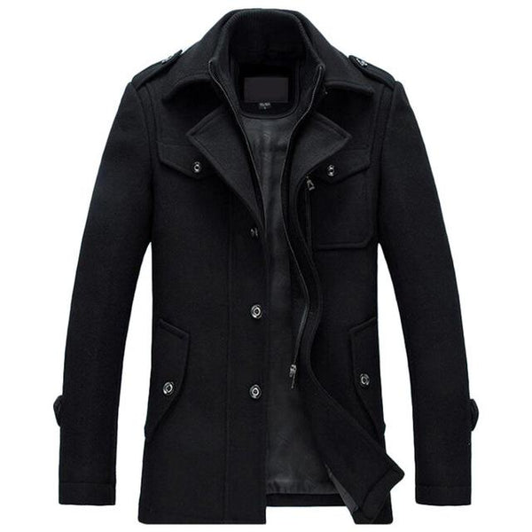 Long plain-colored slim-fit trenchcoat with lapel collar and single-breasted button closure. Has removable same-colored knitted turtleneck collar with zipper closure, attached with zipper. Has two oblique side pockets with no closure, decorated with button flaps, one vertical chest pocket with zipper closure and two inside pockets. Back, shoulders and cuffs are decorated with button straps.
