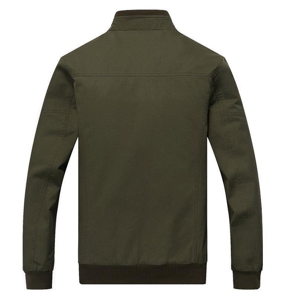 Slim-fit military jacket with zipper and snap fastener closure and standing collar. Has two oblique side pockets with no closure, one horizontal chest pocket with snap fastener flap, one vertical chest pocket with zipper closure, decorated with horizontal snap fastener flap, and one inside pocket. Lower hem, cuffs and the inside of the collar are fitted and ribbed. Available in plain military colors, decorated with shoulder flaps.