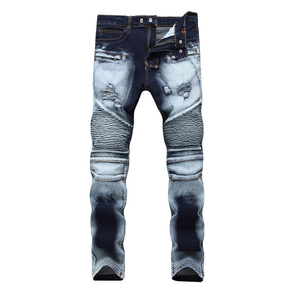Skinny-fit heavily stonewashed straight jeans with zipper fly and regular waist. Has two oblique and one horizontal side pockets and two horizontal rear pockets, all with no closure and two horizontal side pockets with zipper closure. Decorated with striped quiltings and fringed holes on front legs.