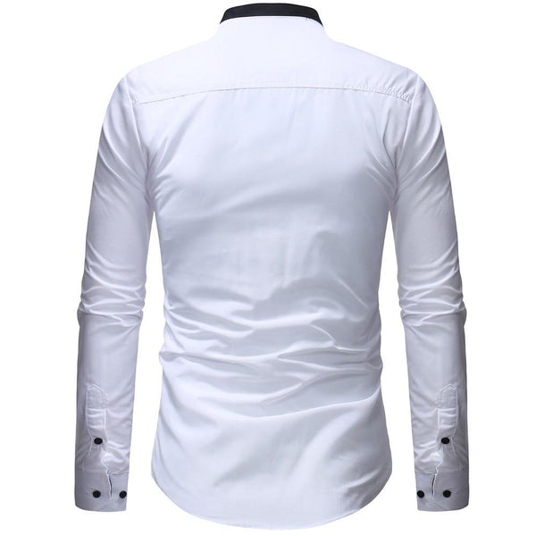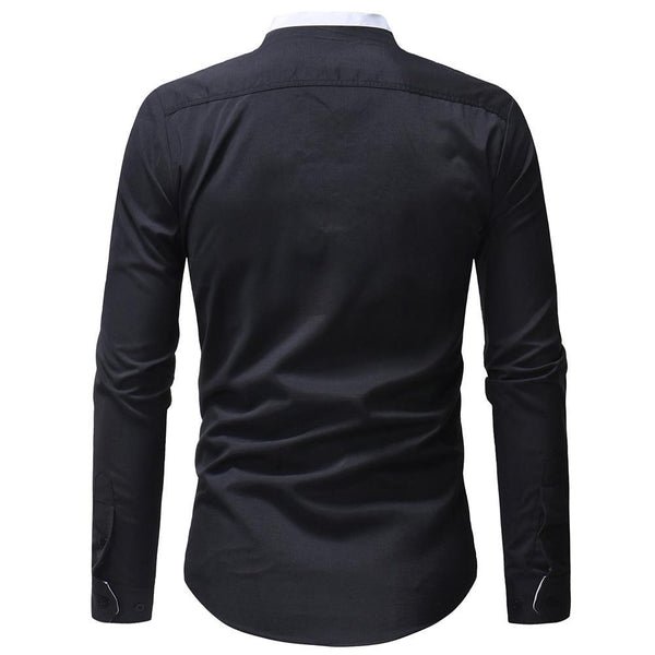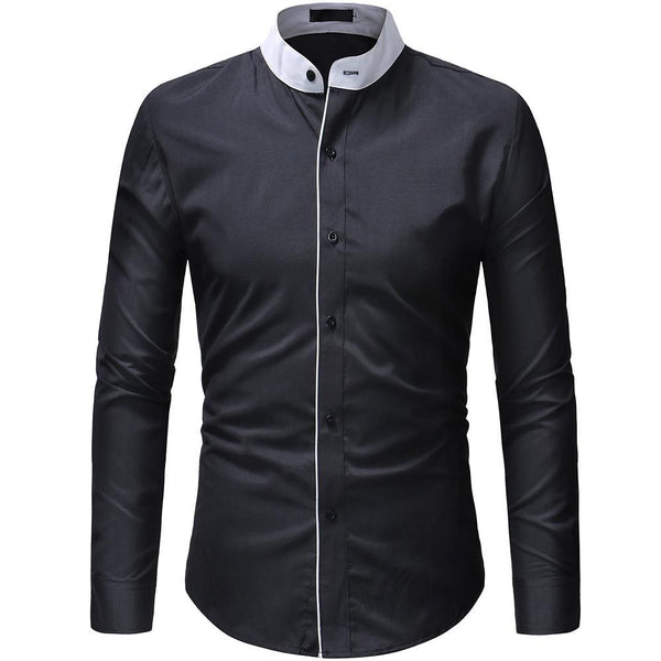 Button down shirt with long sleeves, mandarin collar. Available in white and black, with contrasting colored collar.