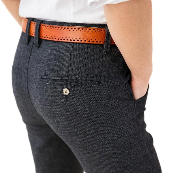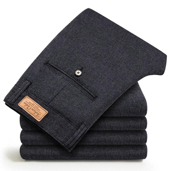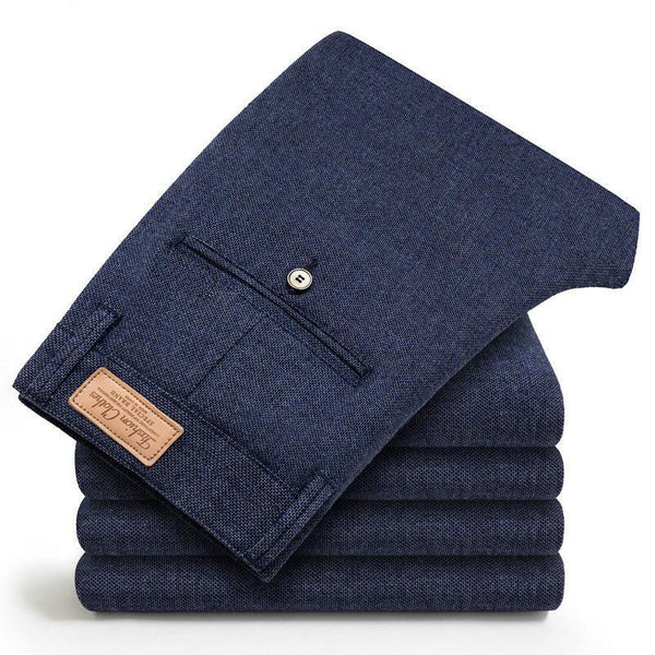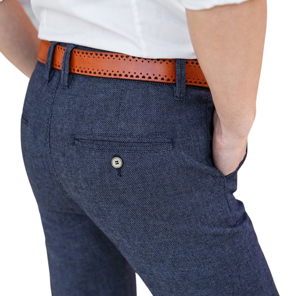 Stylish slim-fit chino pants crafted from soft-touch woven fabric. Features a regular waist, zipper fly, slash pockets on the front and welt pockets on the back. In blue and black.
